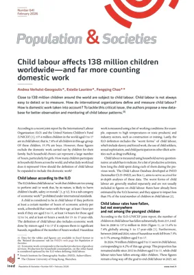 Close to 138 million children aged 5 to 17 around the world are in child labour, according to a joint report published by the ILO and UNICEF in 2025. Sub-Saharan Africa remains the most strongly affected region, with 87 million children there in child labour. However, it is also an issue in certain regions of Europe, such as the Balkans. These estimates, moreover, are based on a strictly economic definition of work and exclude a large proportion of the domestic work performed by children. The Child Labour Database (CLD–INED), on the other hand, highlights the significant engagement of children across the globe in household chores, as well as the large workload that such chores represent for children, particularly girls.